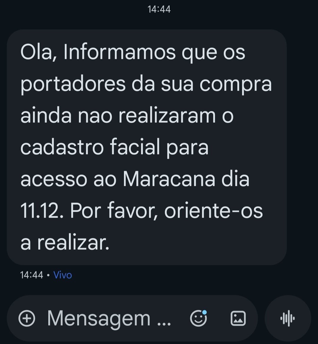 💢🚨 Atenção pra quem comprou ingresso para o primeiro jogo da copa do brasil. Vários amigos relatando o recebimento do SMS abaixo. Confirmem se a facial está cadastrada na bepass do Maracanã.