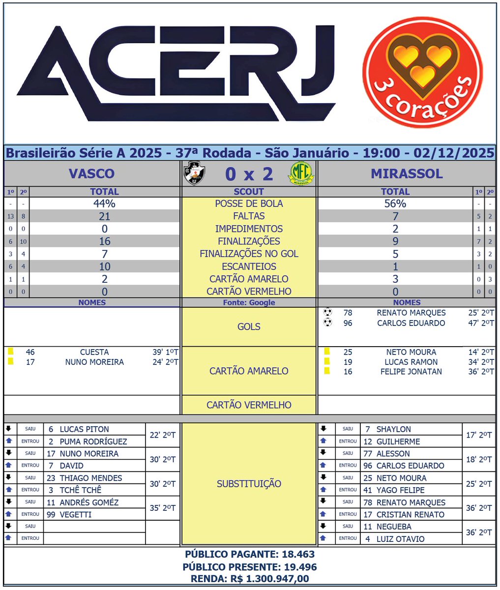 Scout Final de Vasco e Mirassol pela 37ª Rodada do Campeonato Brasileiro 2025 em São Januário (Fonte: Google) #Acerjinforma #brasileirao2025 #VASxMIR #VascodaGama #MirassolFC @Brasileirao @VascodaGama @mirassolfc