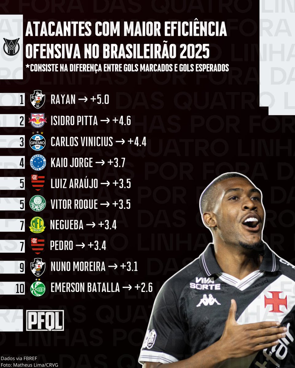 💢⚽️ O ranking da eficiência ofensiva dos atacantes do Brasileirão 2025 tem um novo líder: Rayan, do Vasco, que ultrapassou Isidro Pitta.