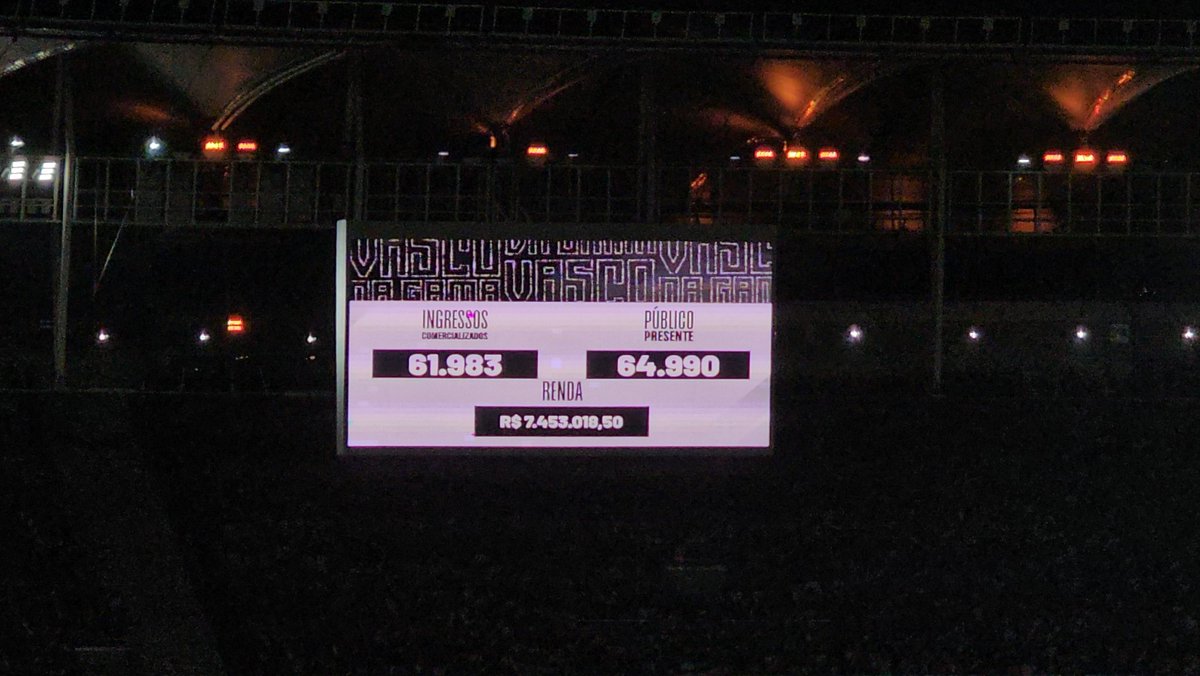 Renda no Maracanã para Vasco x Fluminense: R$ 7.453.018,50. Público: 61.983 pagantes; 64.990 presentes.