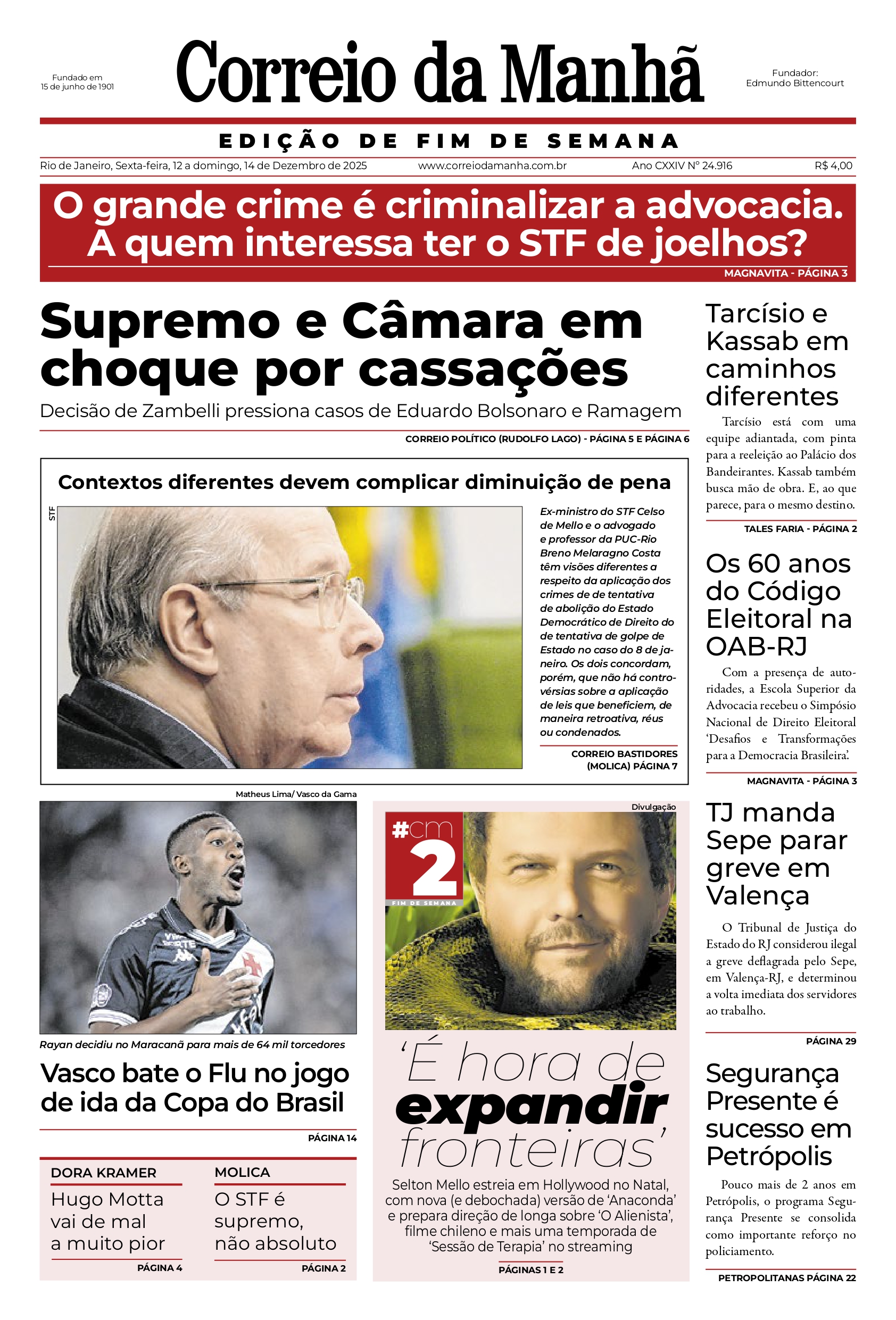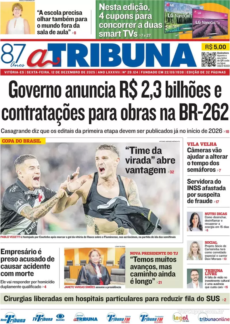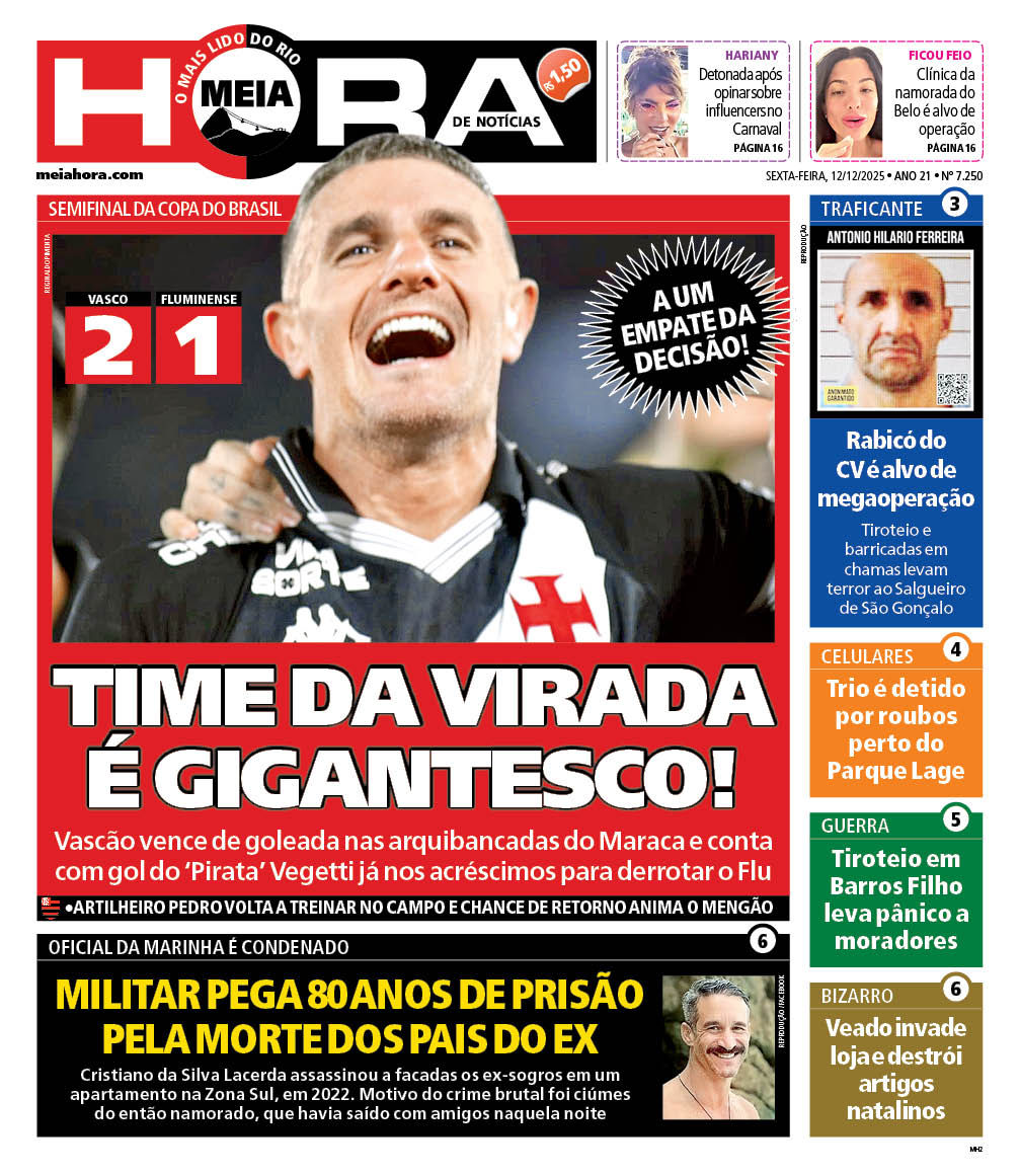 No jogo de ida da semifinal da Copa do Brasil, o Vasco venceu o Fluminense por 2 a 1, de virada, com gols de Rayan e Vegetti, ficando com a vantagem do empate para a partida de volta. Veja as capas dos jornais.