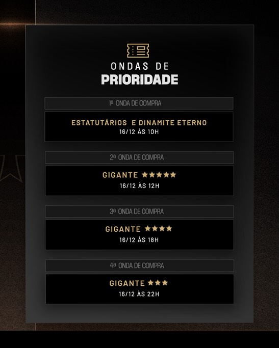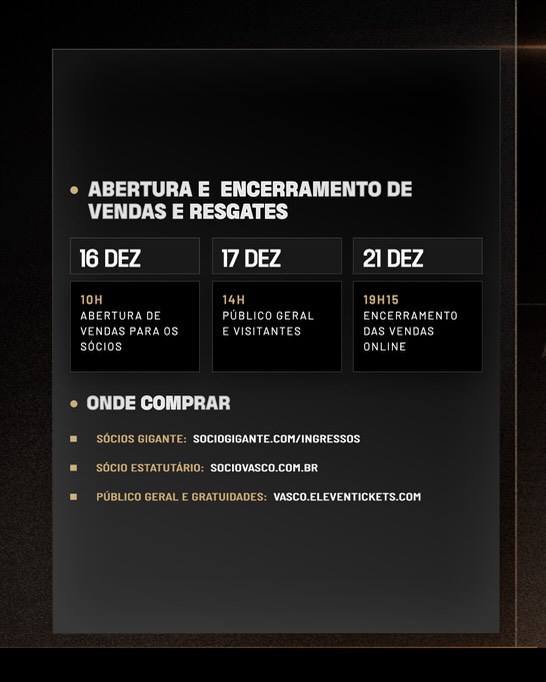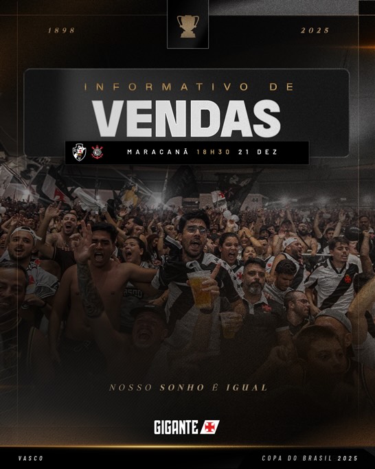 🎟️ Os ingressos para a partida de volta da final da Copa do Brasil (21/12), contra o Corinthians, estarão à venda a partir desta terça-feira (16), às 10h.