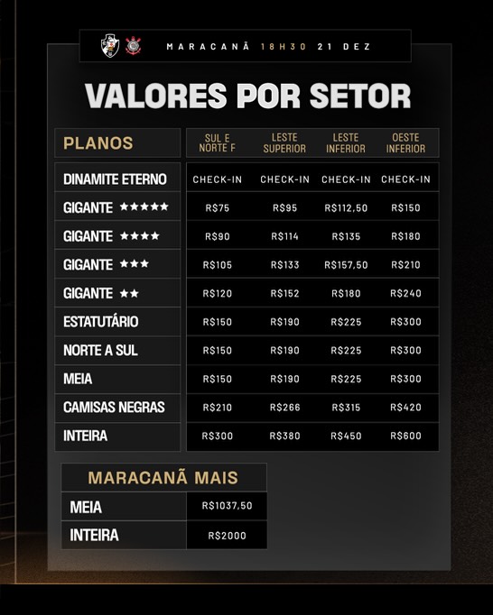 Sul (Vasco): Inteira – R$ 300,00 | Meia – R$ 150,00