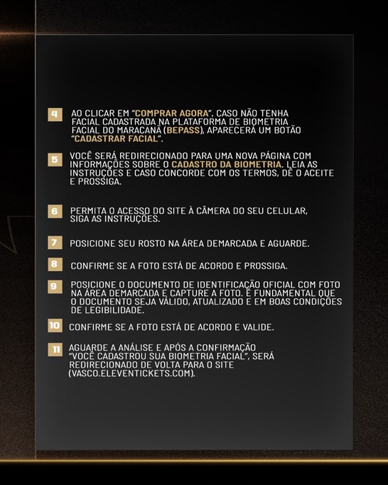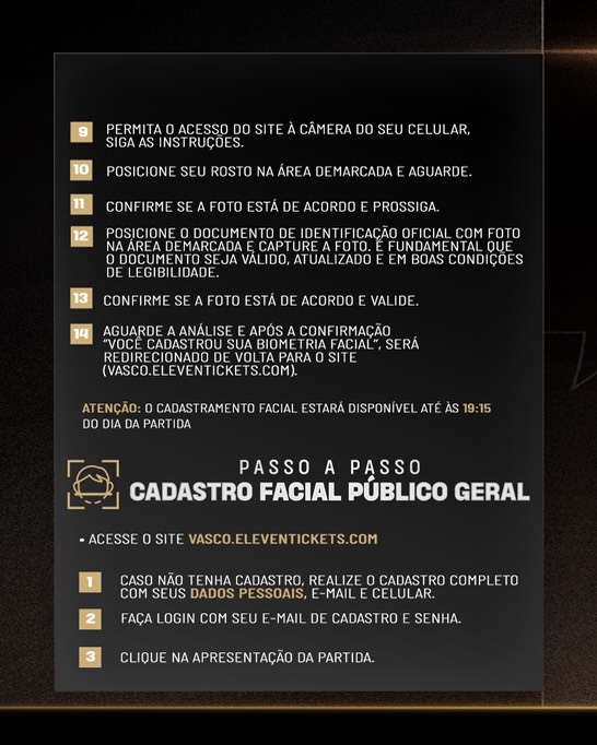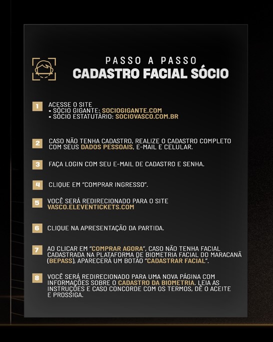 Ao clicar em "Comprar Agora", caso não tenha facial cadastrada na plataforma de biometria do Maracanã (HTTPS://VASCO.BEPASS.COM.BR), aparecerá um botão de "CADASTRAR FACIAL".
