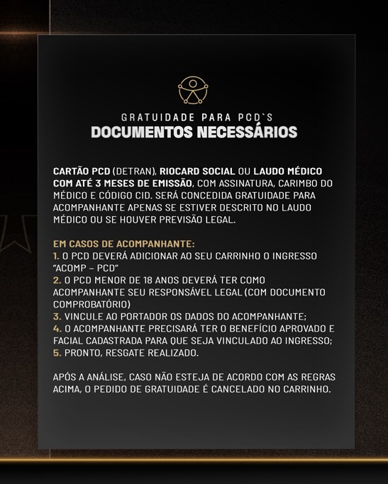 Pessoa com Deficiência: Cartão PCD (Detran), RioCard Social ou laudo médico com até 3 meses de emissão, com assinatura, carimbo do médico e código CID. Será concedida gratuidade para acompanhante apenas se estiver descrito no laudo médico ou se houver previsão legal.
