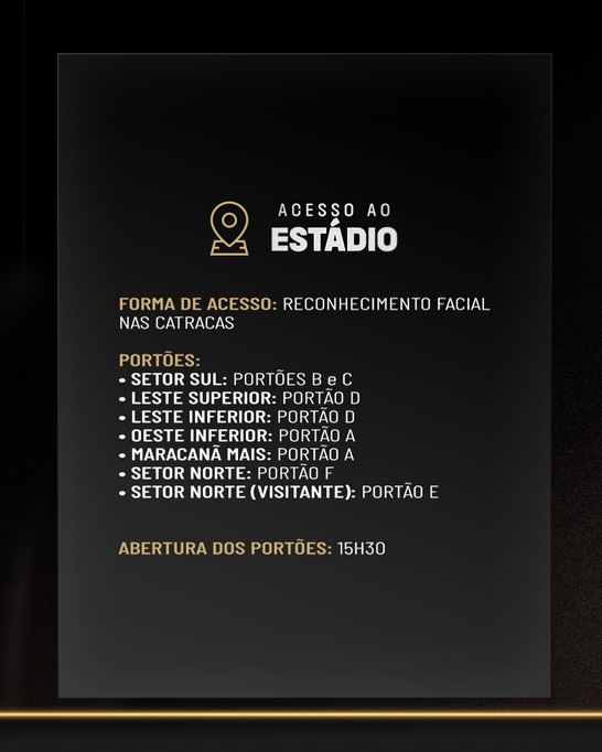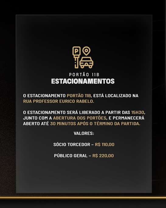 O estacionamento será liberado a partir das 15h30, junto com a abertura dos portões, e permanecerá aberto até 30 minutos após o término da partida.