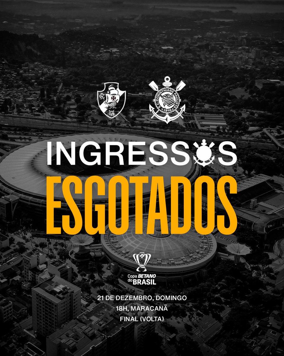 O Sport Club Corinthians Paulista informa que os ingressos disponíveis para o jogo de volta da final da Copa Betano do Brasil 2025, no Maracanã, estão esgotados.