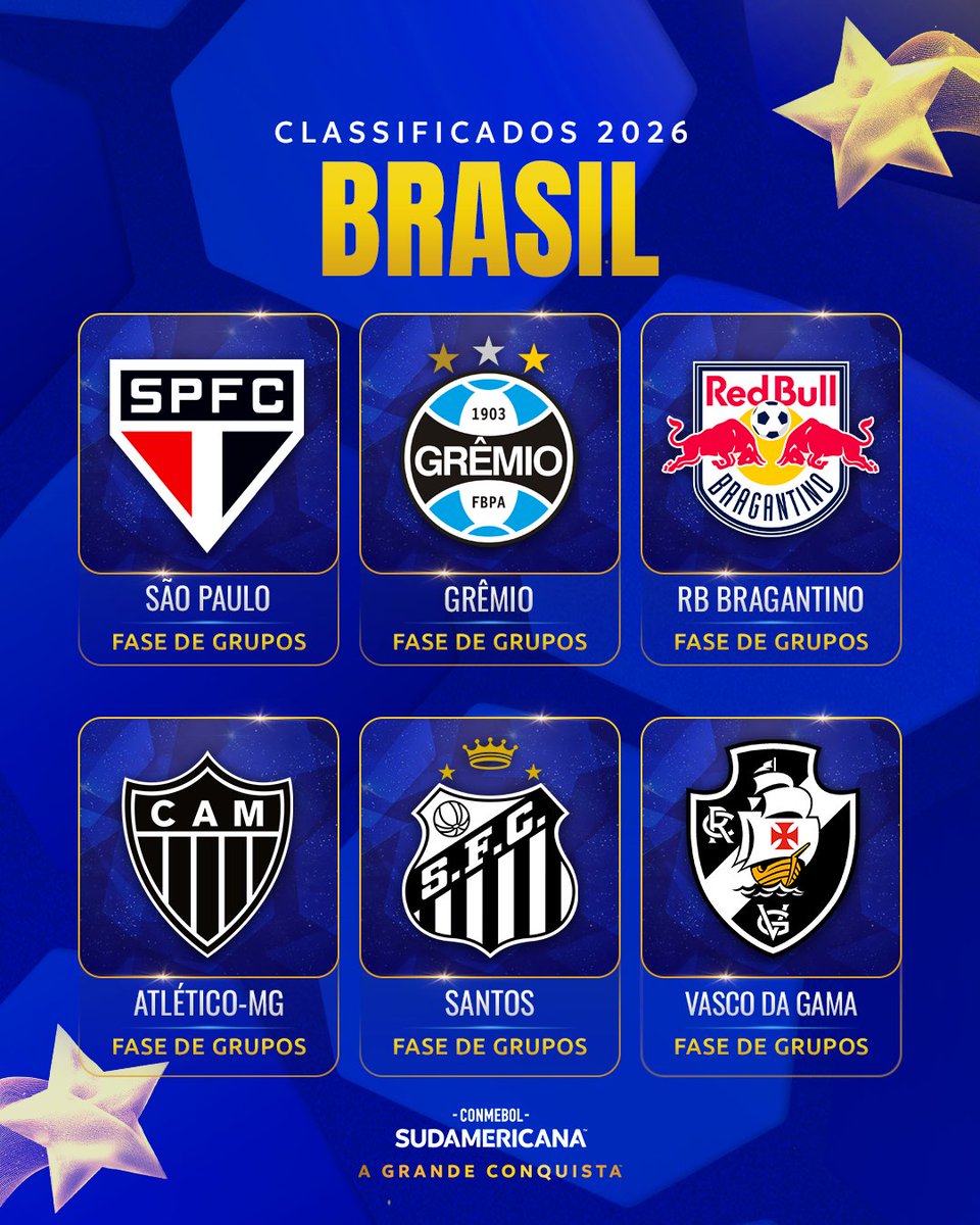 🇧🇷🏆 Os 6⃣ clubes que irão representar o Brasil na Fase de Grupos da CONMEBOL #Sudamericana 2026 estão definidos!