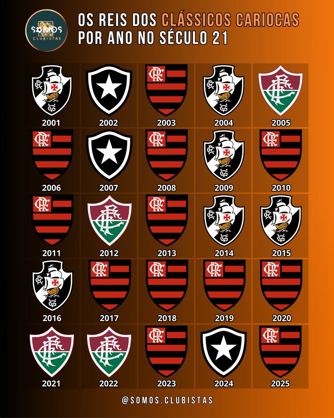 O Flamengo terminou como Rei dos Clássicos do futebol carioca em 2025. Com um aproveitamento de 69% em 14 partidas, o Rubro-Negro manteve a hegemonia no século 21. Confira os reis dos clássicos cariocas no século 21.