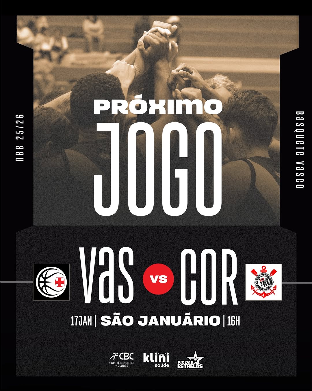 AMANHÃ é dia de jogão em São Januário! 🏀💢 O Vasco da Gama entra em quadra às 16h para enfrentar o Corinthians, pelo NBB CAIXA 25/26.
