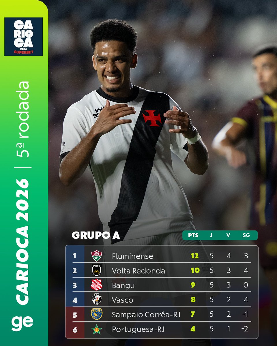 Com o empate sem gols entre Vasco e Madureira, assim ficou a classificação do Grupo A da Taça Guanabara após a 5ª rodada.