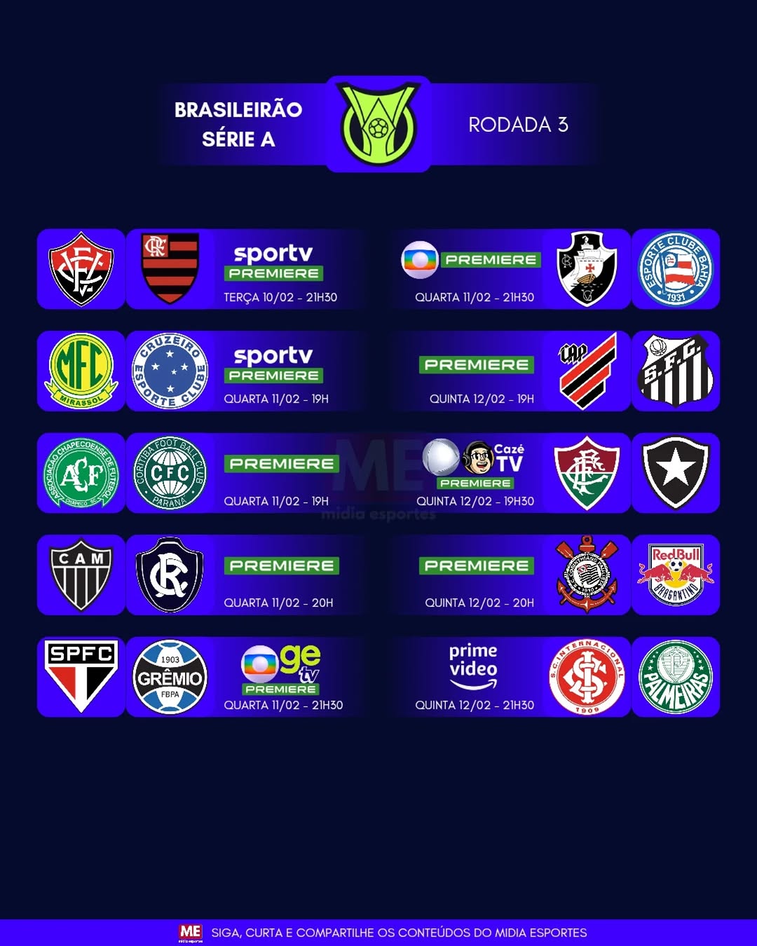 Confira a agenda de transmissões da 3ª rodada da Série A do Campeonato Brasileiro.