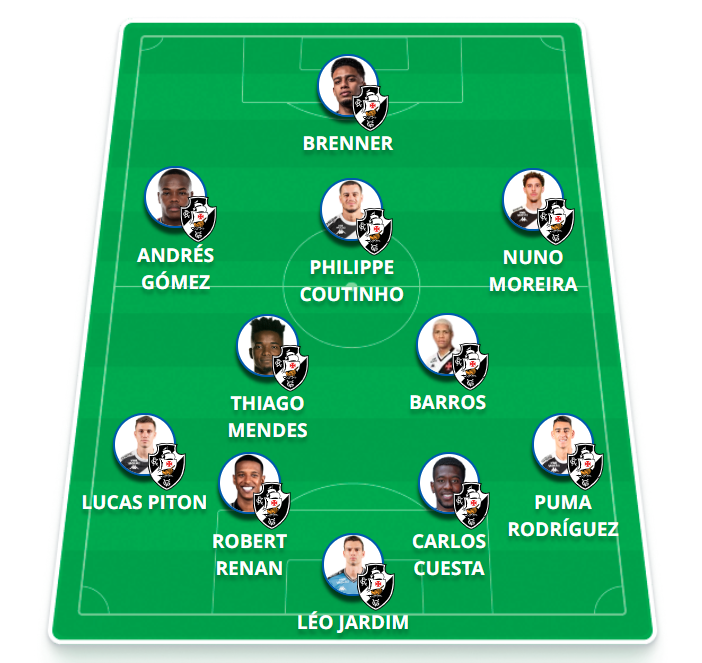 Provável time do Vasco: Léo Jardim; Puma Rodríguez (Paulo Henrique), Cuesta, Robert Renan, Lucas Piton; Barros, Thiago Mendes; Andrés Gómez, Coutinho, Nuno Moreira; Brenner.