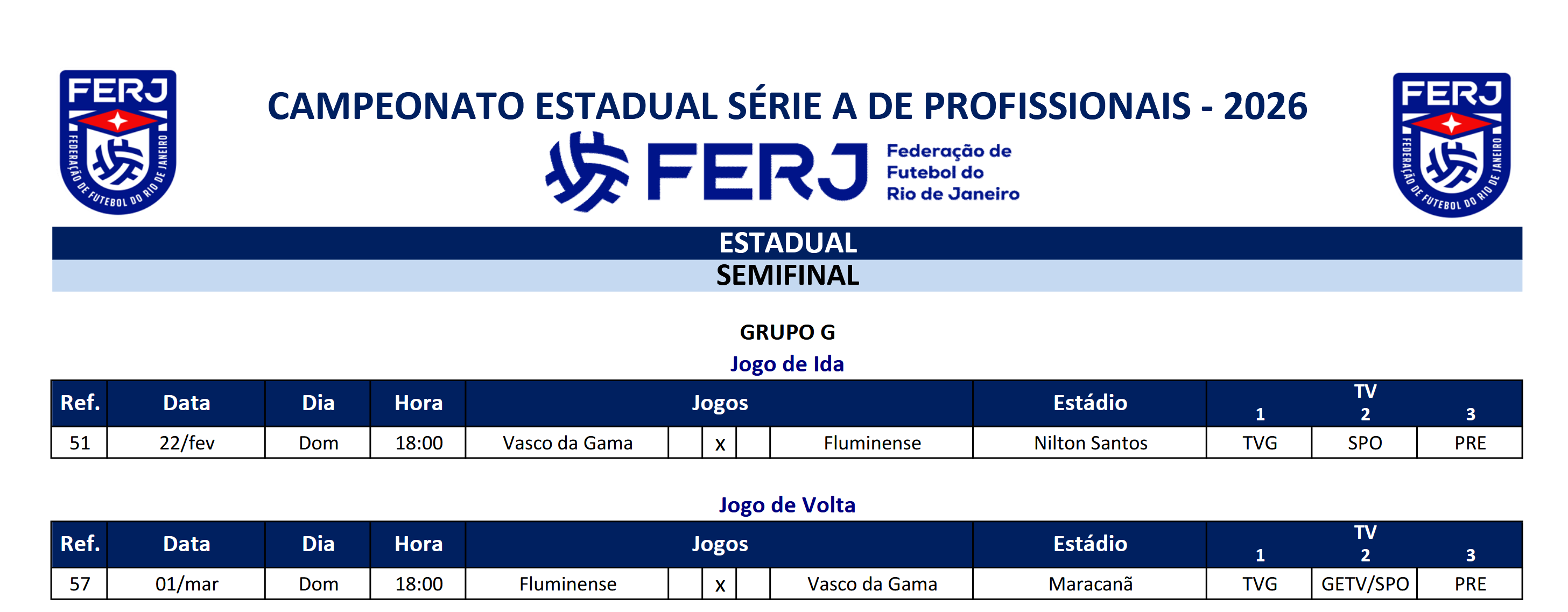 O Federação de Futebol do Estado do Rio de Janeiro (FERJ) confirmou a primeira partida da semifinal do Cariocão entre Vasco e Fluminense para o Estádio Nilton Santos. A partida acontece no próximo domingo, às 18h.