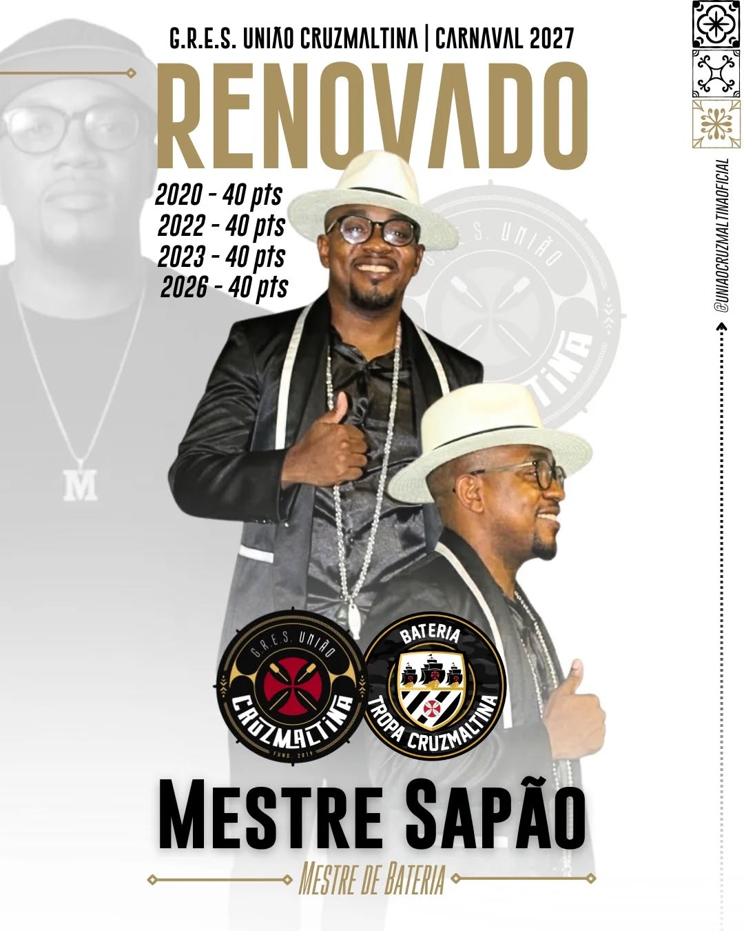 O EXUBERANTE FICA 🥁⚡️💢| A União Cruzmaltina confirma, com satisfação e orgulho, a renovação de Guilherme Sapão como mestre de bateria para o Carnaval 2027. Estando fora apenas em 2024 e 2025 porém participando dos 3 primeiros anos da agremiação à frente da Tropa Cruzmaltina, o mestre construiu uma trajetória técnica irretocável, alcançando 40 pontos em todos os desfiles, consolidando um padrão de excelência e regularidade raro no Carnaval carioca.