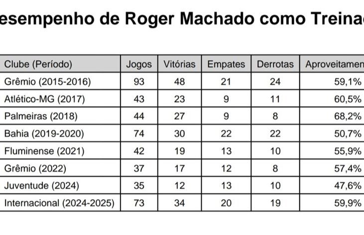 Números de Roger Machado como treinador.