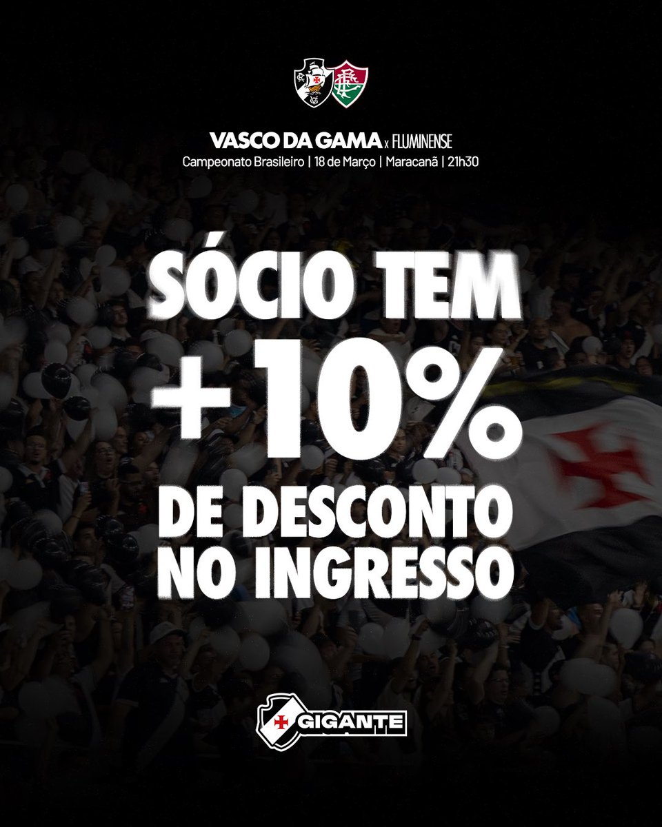 CONDIÇÃO ESPECIAL PARA SÓCIO GIGANTE: +10% de desconto na compra do ingresso para Vasco x Fluminense.