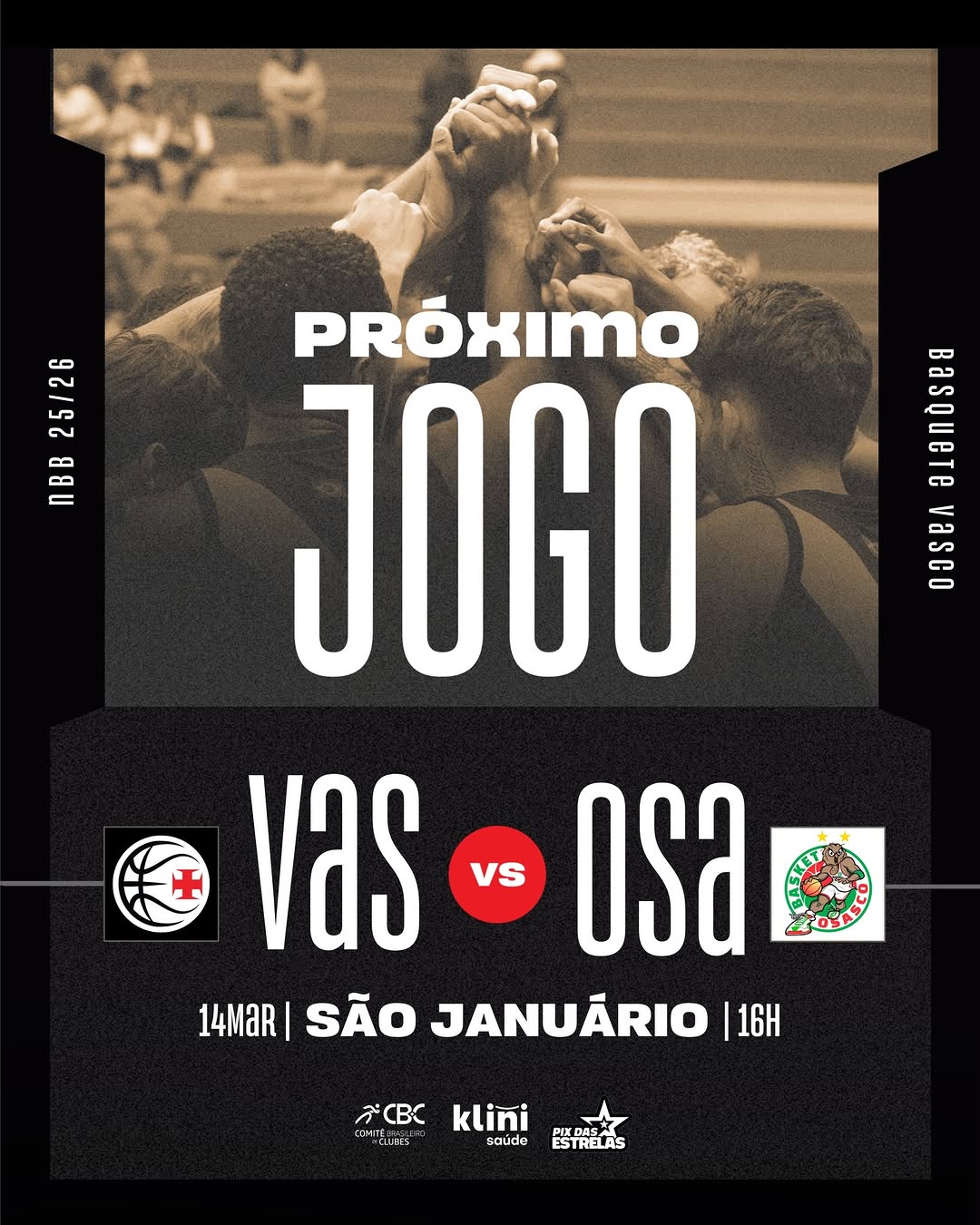 AMANHÃ é dia! 💢 Às 16h, o Vasco da Gama enfrenta o Osasco em São Januário, em mais um desafio pelo NBB CAIXA 25/26. Depois de um tempo longe de casa, é hora de voltar e sentir a força da MAIS LEAL nas arquibancadas.