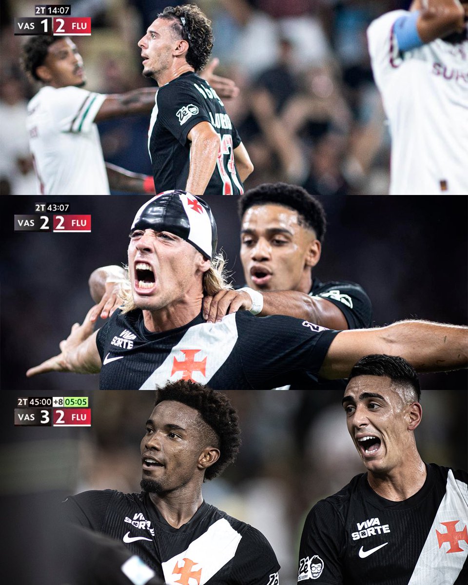 Vasco posta fotos das comemorações dos 3 gols contra o Fluminense com os minutos do jogo; veja