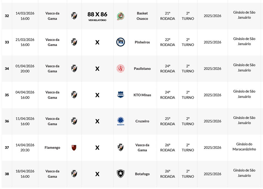 Precisando vencer para escapar do rebaixamento no NBB, o Vasco terá uma série de seis jogos em casa nos próximos dias, fechando a fase regular da competição. A sequência inclui clássicos cariocas contra Flamengo e Botafogo. O Vasco é atualmente o antepenúltimo colocado e dois times caem para a divisão inferior. Veja abaixo o calendário vascaíno.