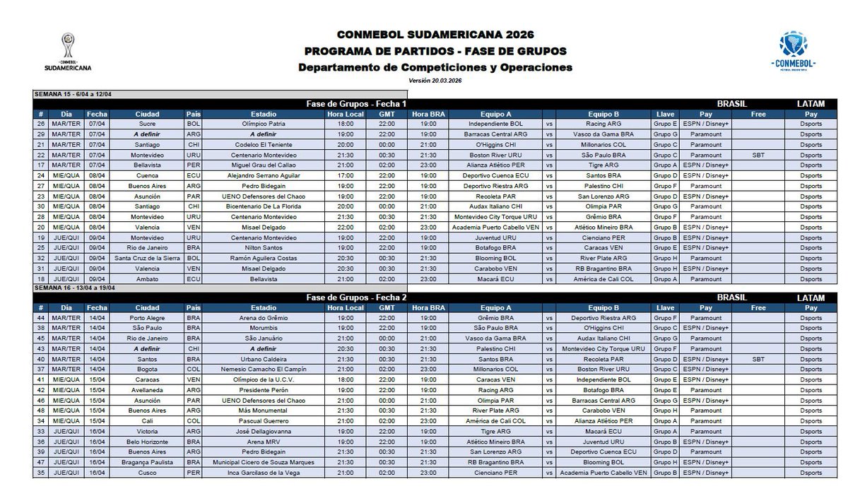 💢🏆 DIAS E HORÁRIOS DOS JOGOS DO VASCO NA COPA SUL-AMERICANA 2026: