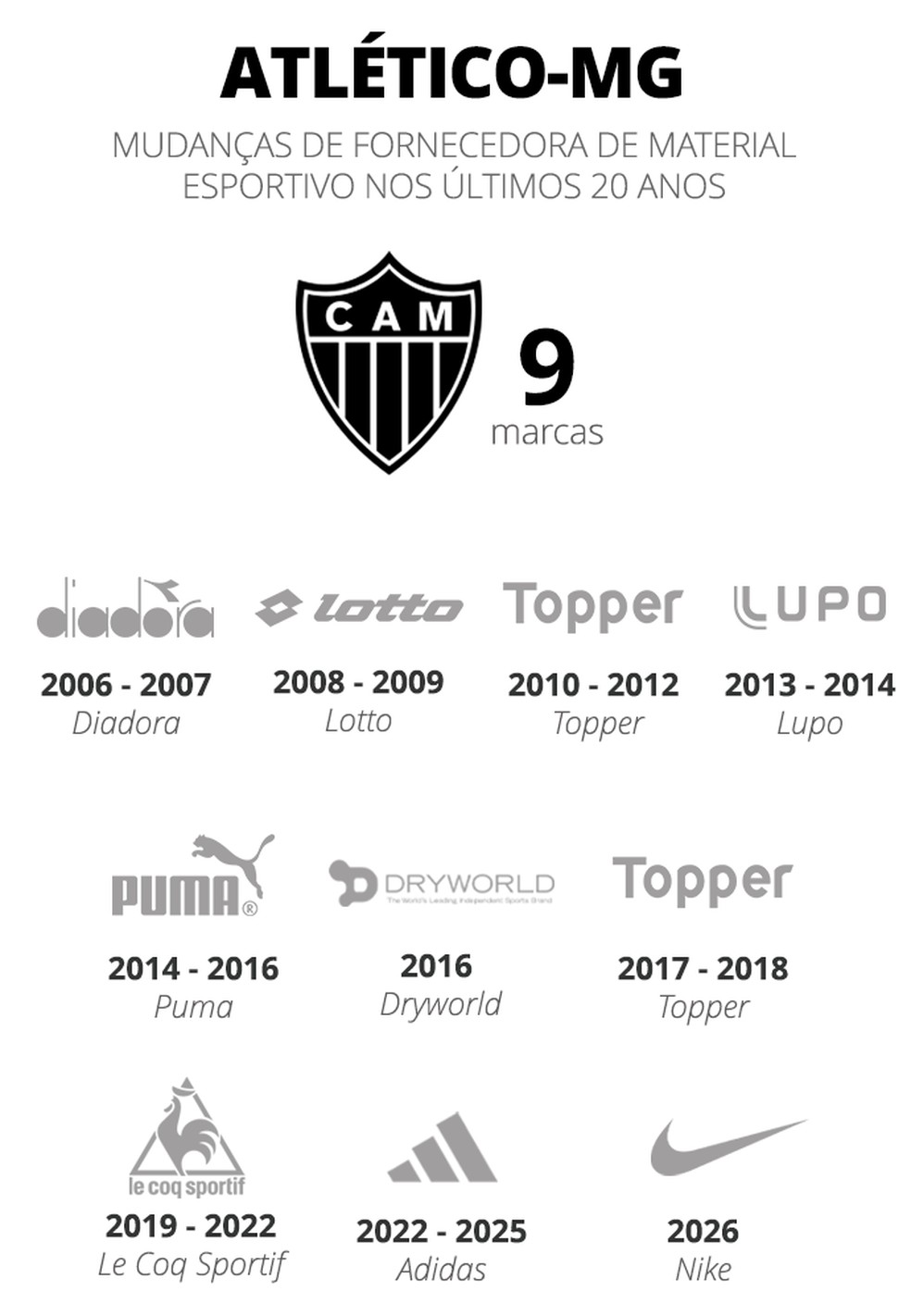 O Galo, aliás, é o time que mais modificou a marca da camisa em um recorte de 20 anos. A Nike, nova fabricante dos uniformes, é o 10º parceiro diferente do clube mineiro nas últimas duas décadas.