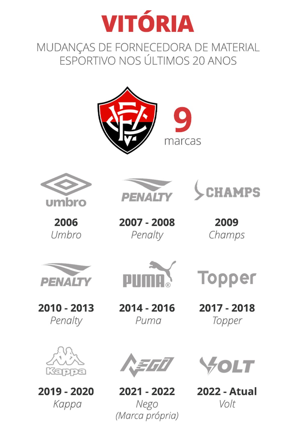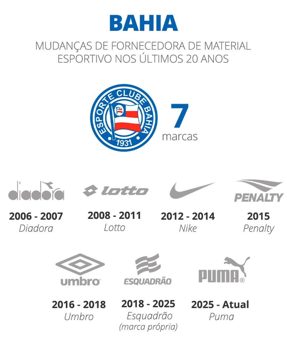 O Vitória teve um período com marca própria, a Nego, entre 2021 e 2022. O rival Bahia teve situação semelhante. A marca Esquadrão esteve no uniforme tricolor por sete anos (2018 a 2025) até fechar com a Puma, que fabrica uniformes de outros clubes do Grupo City.