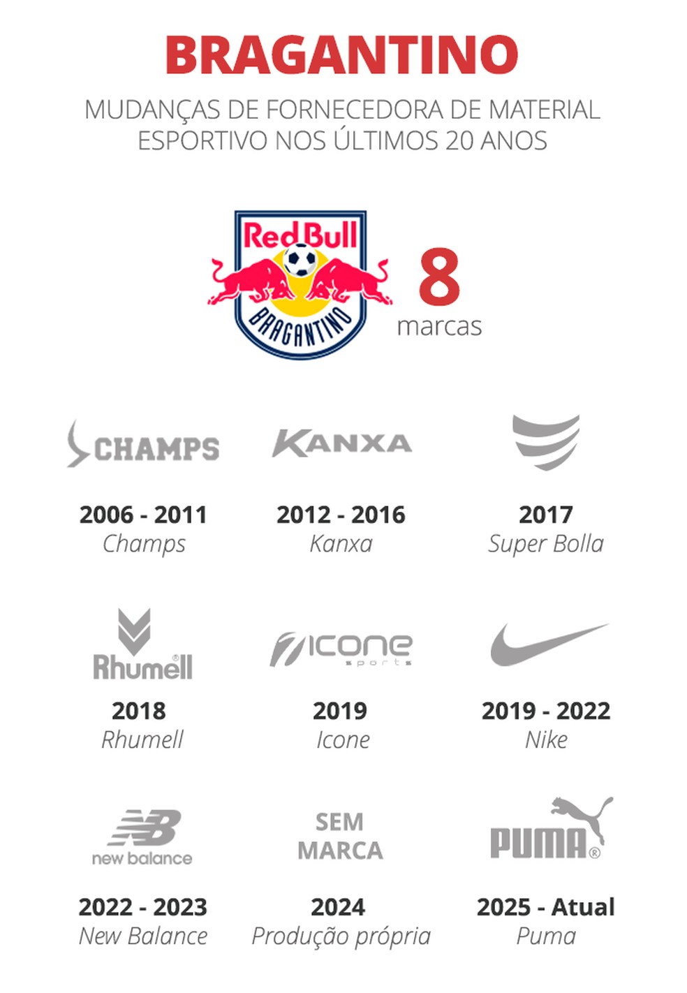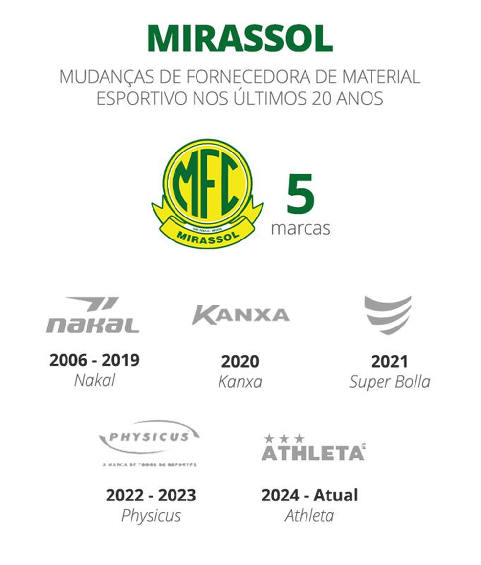 Abaixo na lista aparecem Bragantino e Vitória, com nove. No caso do time paulista, se considera também a recente temporada de 2024, quando, sem fornecedor, tinha produção própria das camisas, sem estampar nenhuma marca.