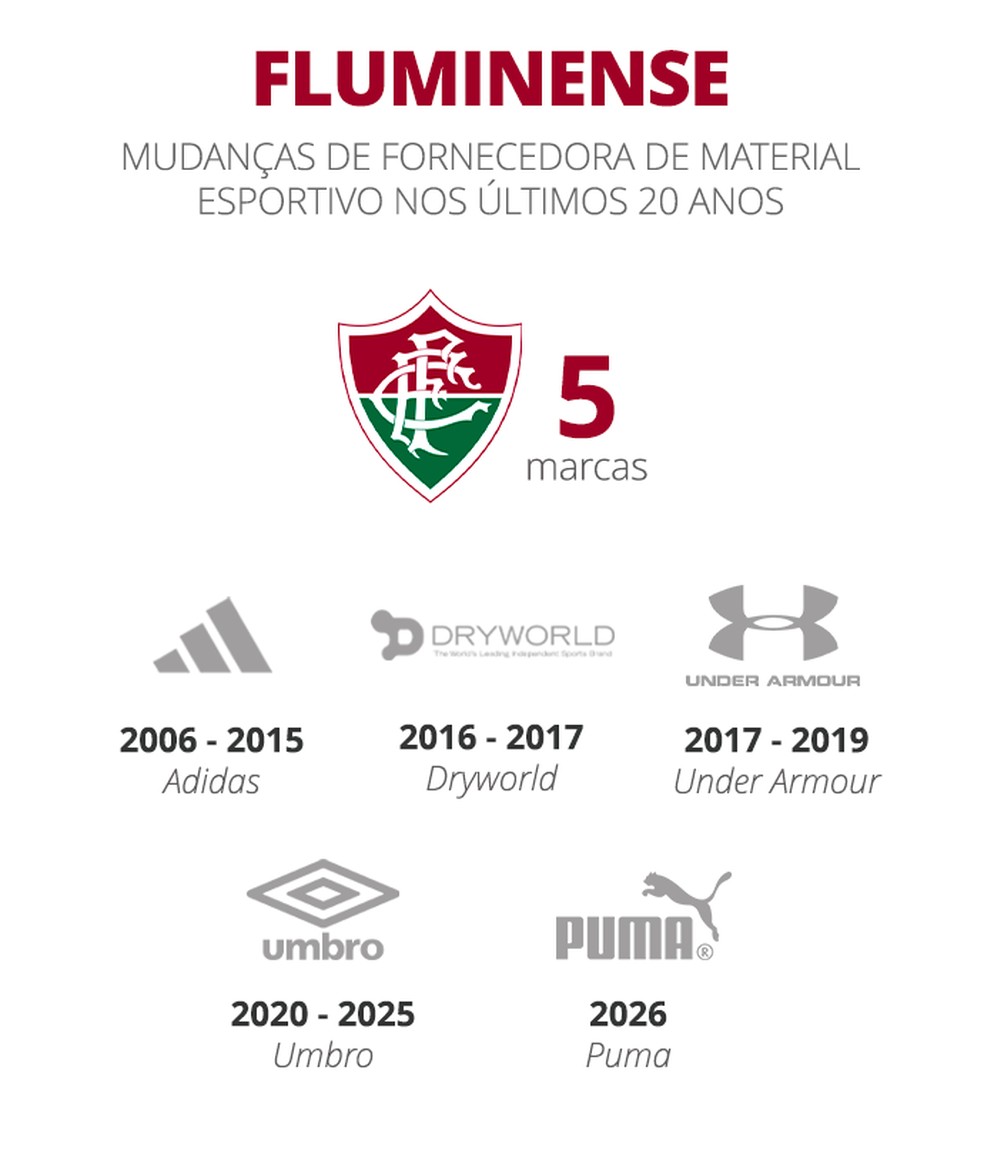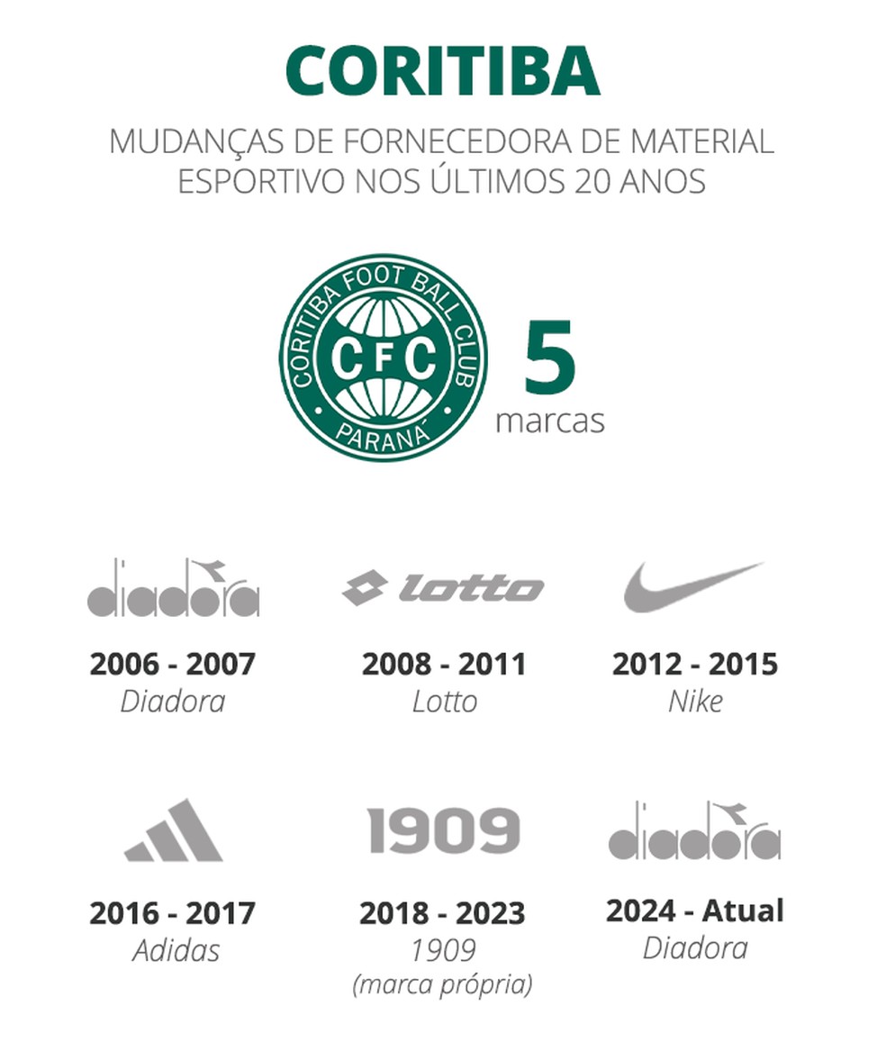 No entanto, o clube que tem há mais tempo o mesmo fornecedor de material esportivo é o Athletico-PR. A Umbro estampa a camisa do Furacão desde 1997. Prestes a completar 30 anos, o vínculo atual tem duração até o fim de 2029.