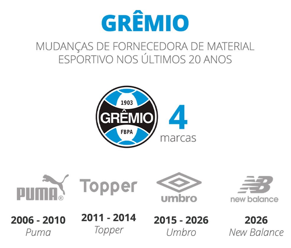 No 2 a 0 sobre o Vitória, na Arena, nesta quinta-feira, o Grêmio estreou o novo uniforme para a temporada. É o início da parceria com a New Balance, após mais de 10 anos com a Umbro. O Tricolor gaúcho é o quarto da Série A do Brasileirão a trocar de fornecedor em 2026.