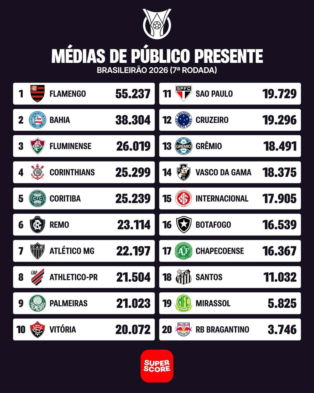 Média de público presente do Brasileirão 2026 até a 7ª rodada: