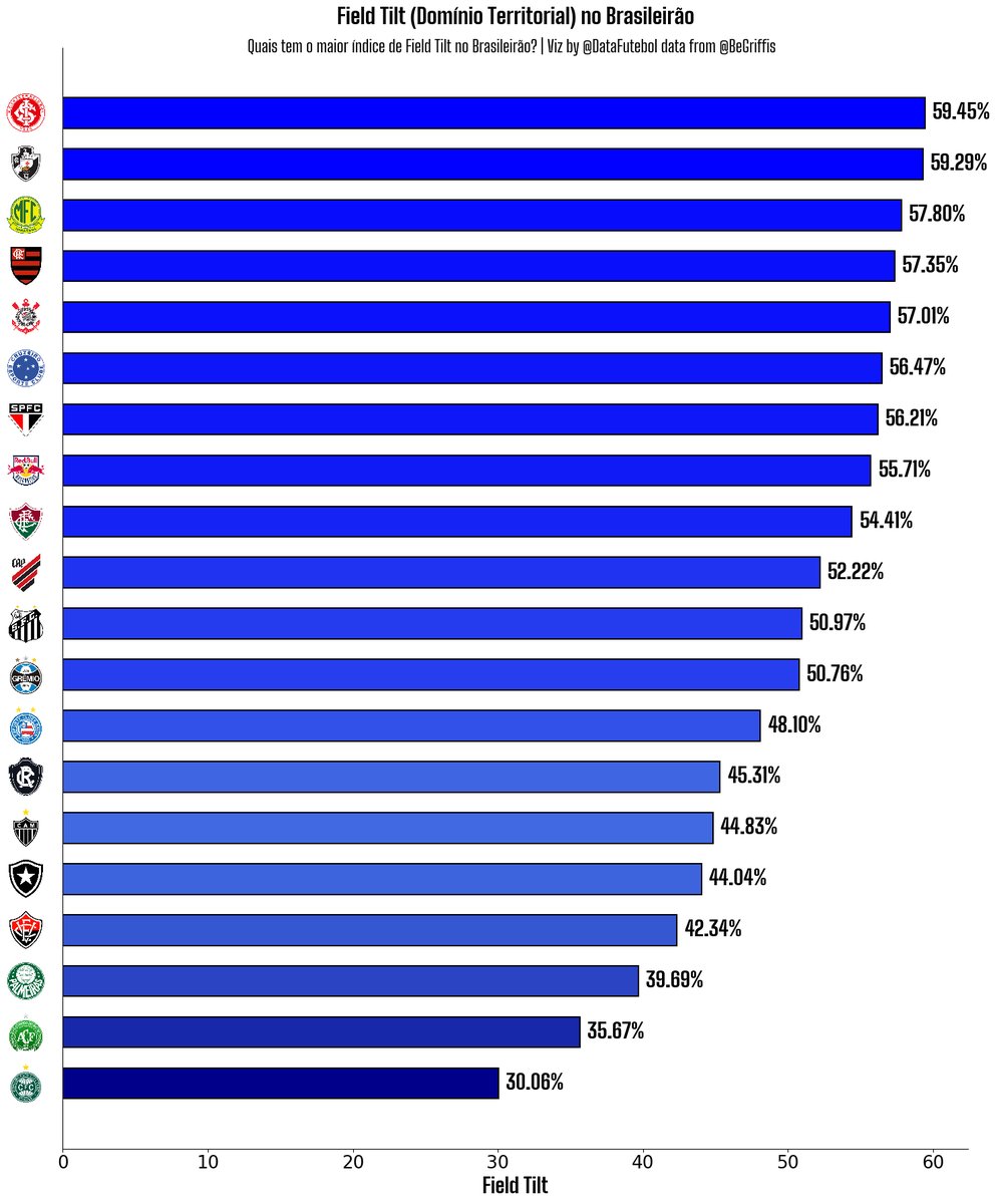 🇦🇹 ➡️Internacional é a equipe que lidera, com cerca de 59.5% de Field Tilt no Brasileirão.