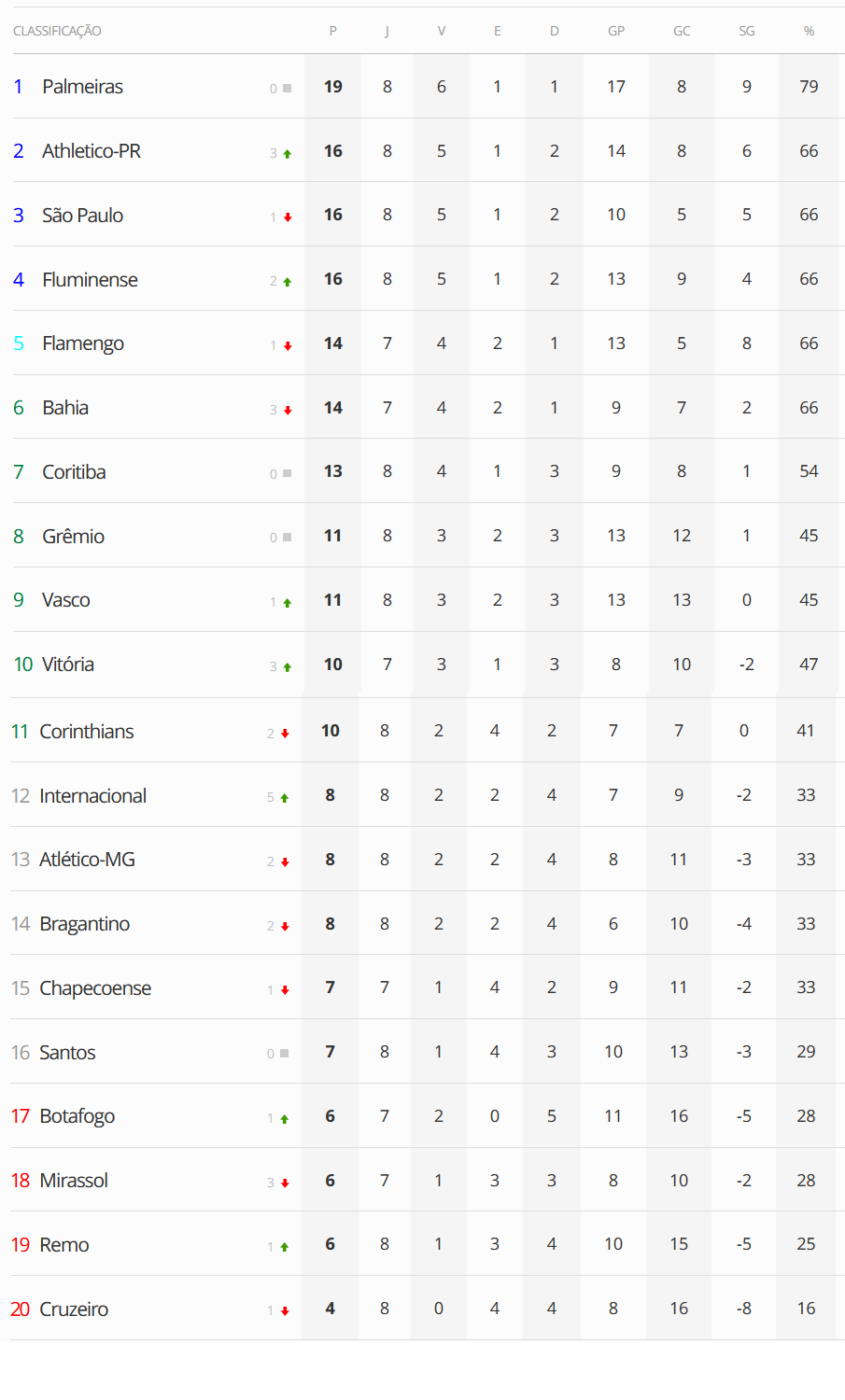 Neste domingo, o Athletico-PR goleou o Botafogo por 4 a 1 em jogo atrasado. O Vasco está na 9ª colocação a 3 pontos do G4, que é a zona de classificação para a Libertadores da América.