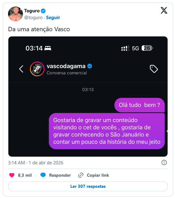O Vasco pode ganhar um reforço fora das quatro linhas e com enorme alcance nas redes sociais. Um dos maiores influenciadores do Brasil, Toguro, movimentou a internet ao demonstrar interesse em uma possível parceria com o clube.