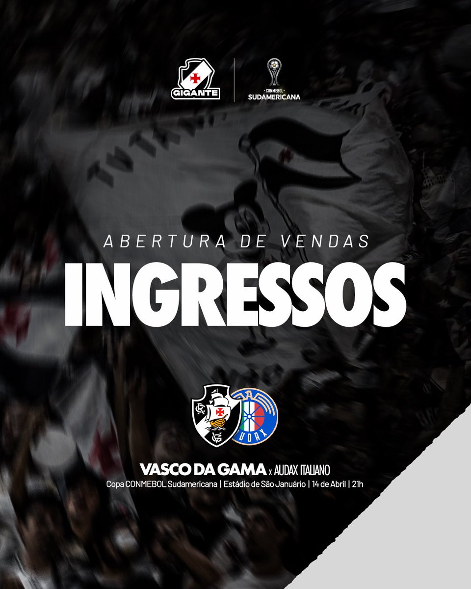 Os ingressos para VASCO x Audax Italiano (14/04), pela Copa CONMEBOL Sudamericana, começam a ser vendidos HOJE, às 12h.