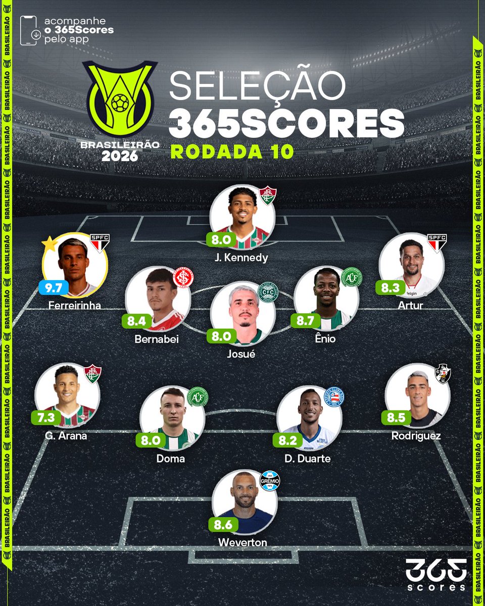 A 10ª rodada do Brasileirão 2026 chegou ao fim e o time ideal está escalado. O São Paulo domina as atenções com Ferreirinha eleito o craque da rodada, acompanhado por Artur.