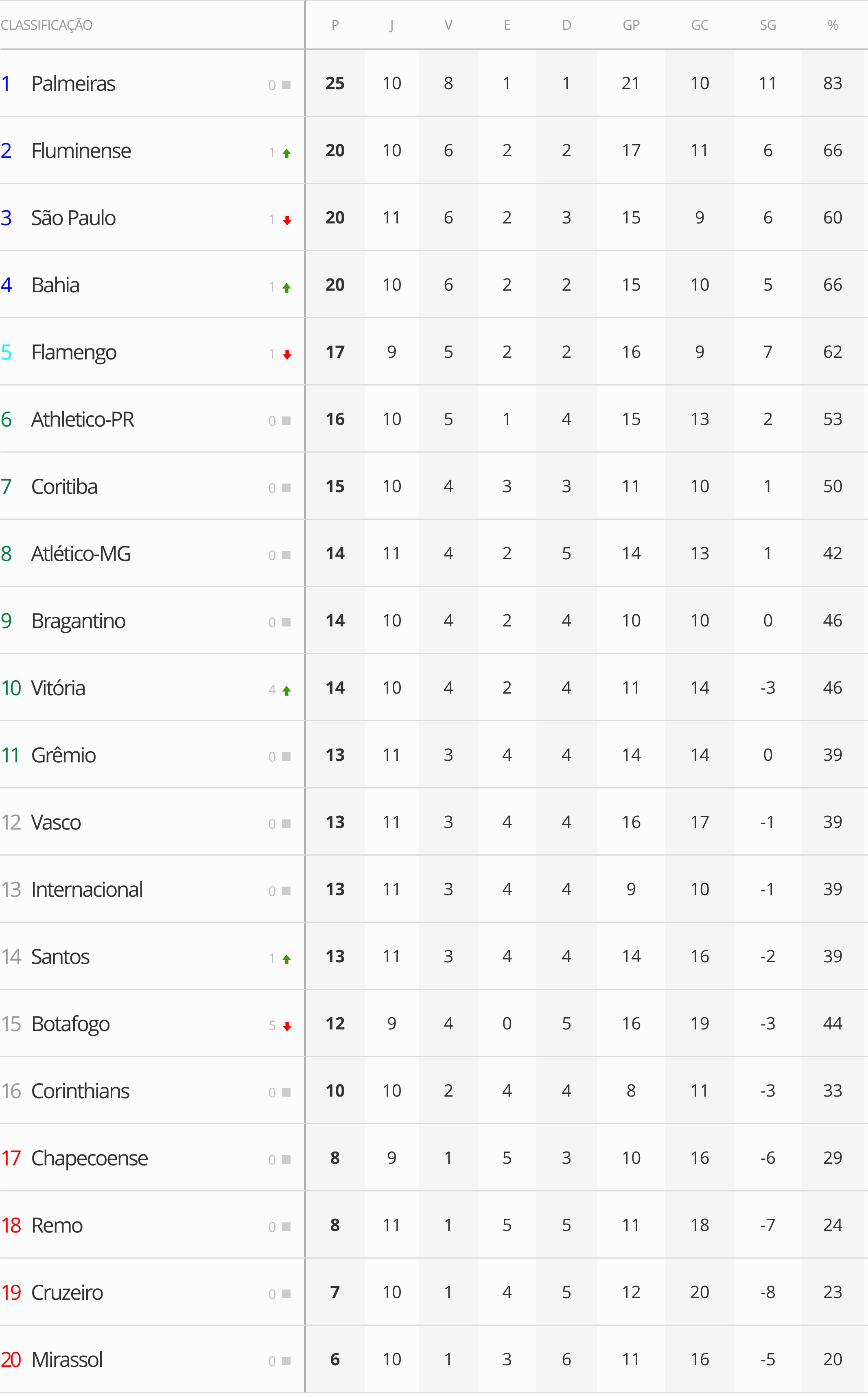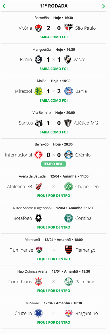 Cinco jogos abriram a 11ª rodada do Campeonato Brasileiro neste sábado. O Vasco, que empatou com o Remo por 1 a 1, está em 12º lugar. Outros cinco jogos serão disputados neste domingo.