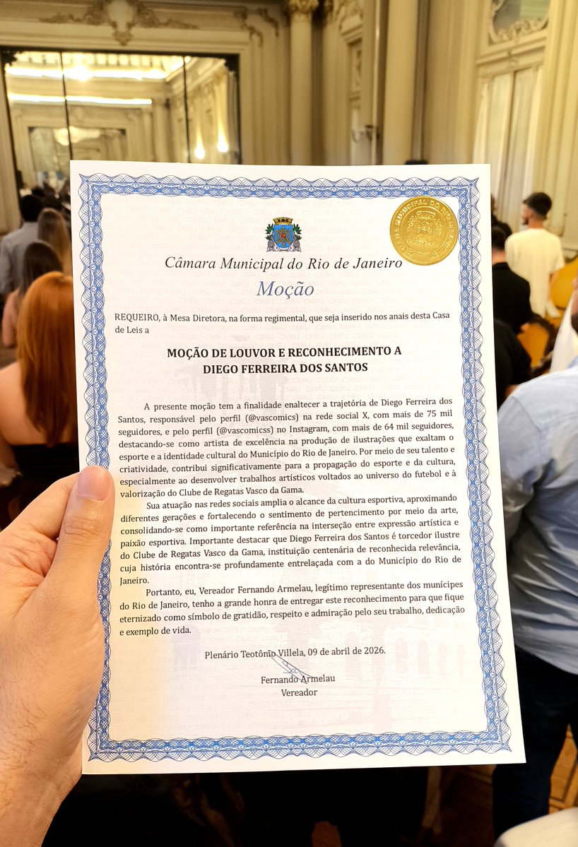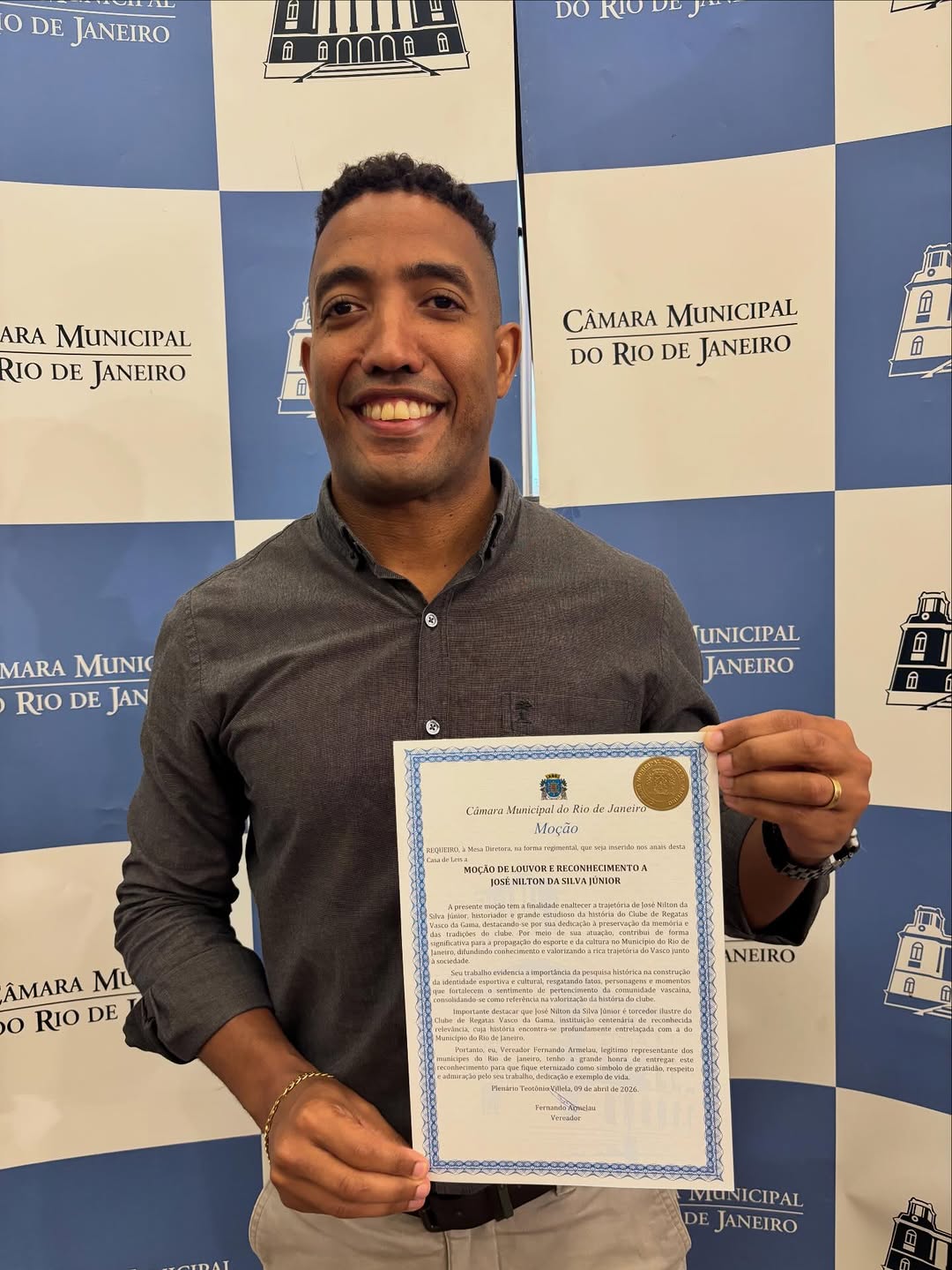 Hoje meu coração vascaíno transborda de gratidão: recebi uma moção de homenagem da Câmara Municipal do Rio de Janeiro, por ocasião do Dia do Vascaíno, no aniversário do grande Roberto Dinamite, em reconhecimento ao meu trabalho de pesquisa e produção sobre a linda história do Club de Regatas Vasco da Gama. Saber que minha dedicação em preservar e contar nossa memória contribui para o futebol além das quatro linhas é motivo de grande orgulho. Agradeço especialmente ao vereador Fernando Arrmelau pelo reconhecimento e por incluir meu nome entre tantos torcedores ilustres do Vasco. Seguimos juntos, mantendo viva a história e a paixão pelo nosso Gigante da Colina. Obrigado, Vasco! Obrigado, torcedor cruz-maltino!!!💢💢💢 #vascodagama #historiamaislindadofutebol #futebol #historia #camisasnegras