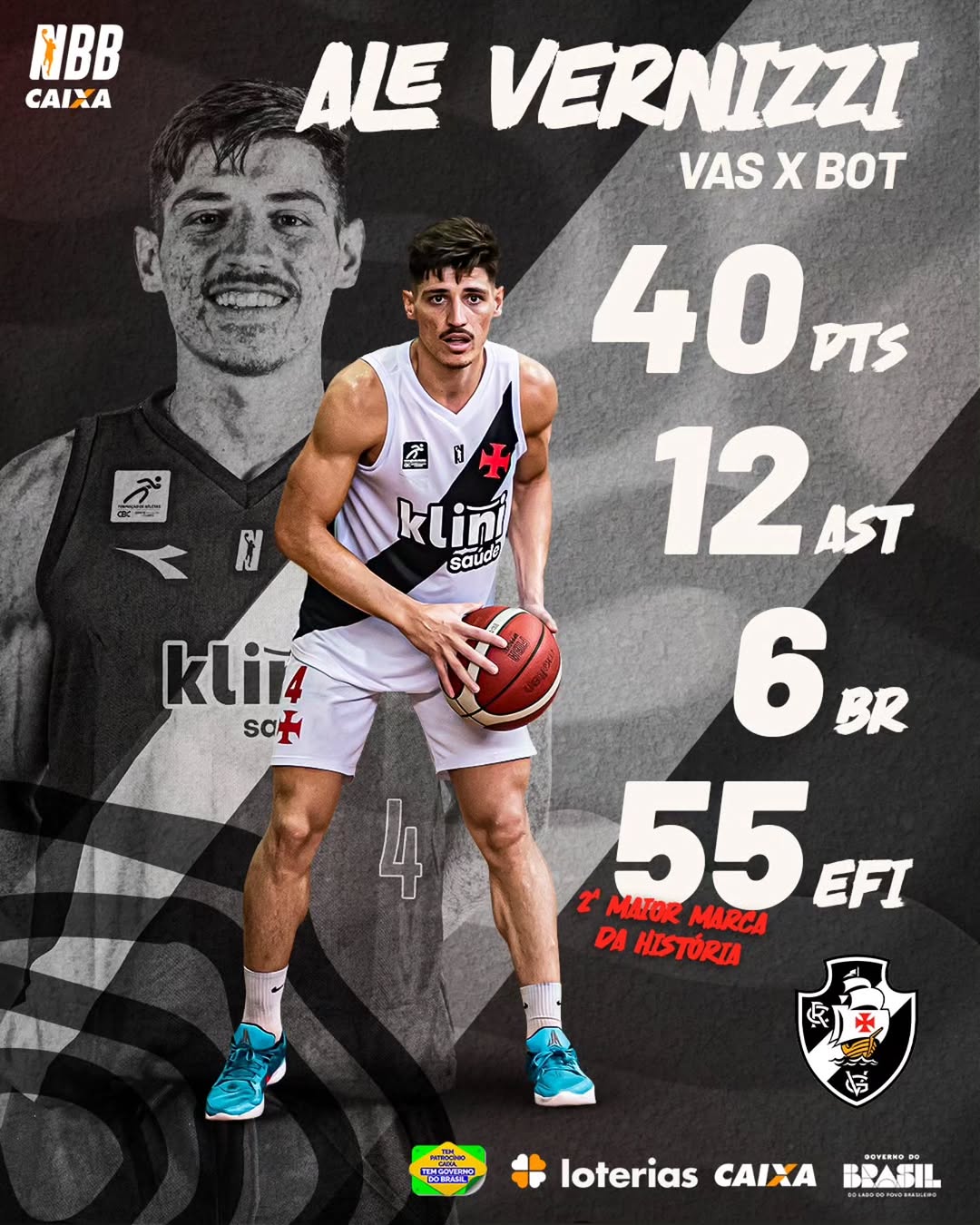 Com isso, o Alê Vernizzi agora aparece atrás apenas de Marcelinho Machado na lista dos maiores índices de eficiência em um jogo do NBB CAIXA. A lenda alcançou 60 de eficiência em 7 de março de 2010, quando, na vitória do Flamengo sobre o São José Basketball, anotou também o recorde histórico de pontos da liga, com 63.