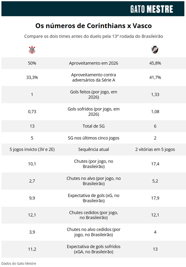 O duelo entre Corinthians e Vasco pode fazer a diferença no seu Cartola nesta 13ª rodada. De um lado, a defesa mais confiável e o ataque que menos chuta; do outro, a defesa mais frágil e o ataque que mais chuta. O Gato Mestre te mostra os números e aponta os caminhos abaixo; considere quem escalar até o fechamento do mercado, às 18h29 (de Brasília) deste sábado (25).