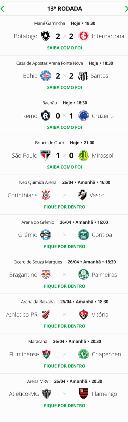 Quatro jogos abriram a 13ª rodada do Campeonato Brasileiro neste sábado. O Vasco, que enfrenta o Corinthians no Itaquerão, está em 10º lugar.