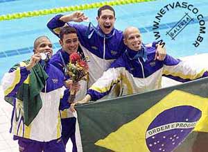 (16/09) Edvaldo Valério, Carlos Jayme e Gustavo Borges no pódio após a prova dos 4x100m livre.