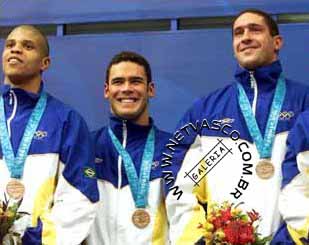 (16/09) Edvaldo Valério, Carlos Jayme e Gustavo Borges exibem as medalhas de bronze no revezamento 4x100m livre.