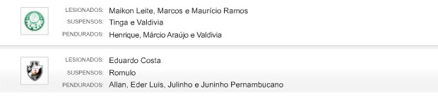 Confira lesionados, suspensos e pendurados de Vasco e Palmeiras