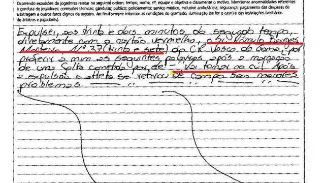 “Expulsei, aos 22 minutos do segundo tempo, diretamente com cartão vermelho, o sr. Rômulo Borges Monteiro, nº 37, por proferir a mim os seguintes palavrões: ‘Vai tomar no cú’ (sic)”, relatou o árbitro na súmula da partida.