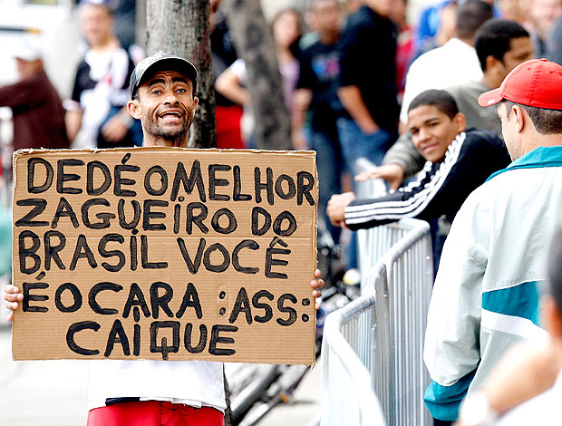 Otimista, torcedor exibe cartaz para o zagueiro Dedé em São Januário