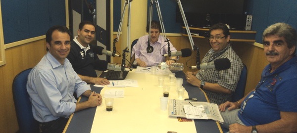 Rodrigo Caetano e Carlos Alexandre ao lado da equipe da Super Rádio Tupi: Rubem Leão, Wagner Menezes, Luiz Penido e Eugênio Leal