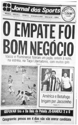 Fluminense e Vasco já estão classificados para a Libertadores do próximo ano. Os rivais, por sinal, foram os protagonistas da única vez em que ocorreu um clássico carioca na maior competição continental. Em 1985, eles se enfrentaram duas vezes: na primeira, um sensacional empate em 3 a 3, destacado na edição do dia 24 de julho daquele ano pelo lornal dos Sports.