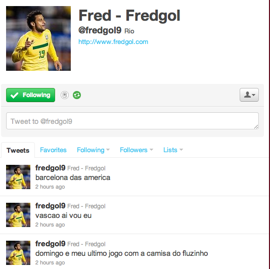 Algo estranho aconteceu com o twitter de Fred, artilheiro e ídolo do Fluminense, na madrugada desta quinta-feira. O atacante postou três tweets estranhíssimos, primeiro dizendo que domingo seria seu último jogo com a camisa do “Fluzinho”. Depois disse que estava indo rumo “ao Vascão”. E por fim escreveu “Barcelona das América”, sem o plural. Terá sido mais um caso de invasão de conta?