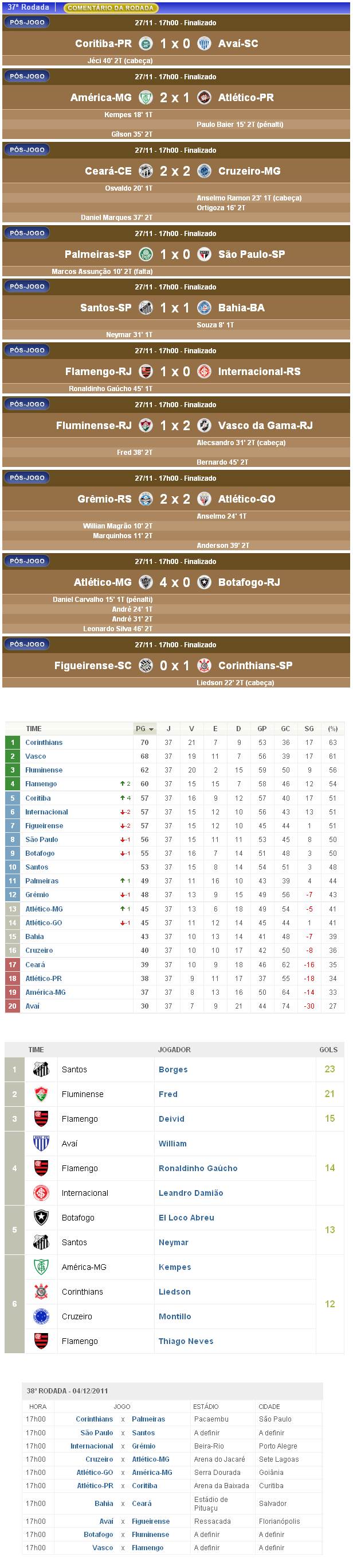 Terminada a 37ª e penúltima rodada do Campeonato Brasileiro 2011 (a 18ª do returno), o Vasco, que derrotou o Fluminense por 2 a 1 e viu o Corinthians vencer o Figueirense por 1 a 0, permaneceu na 2ª posição na tabela e 2 pontos atrás do time paulista, que lidera a competição.